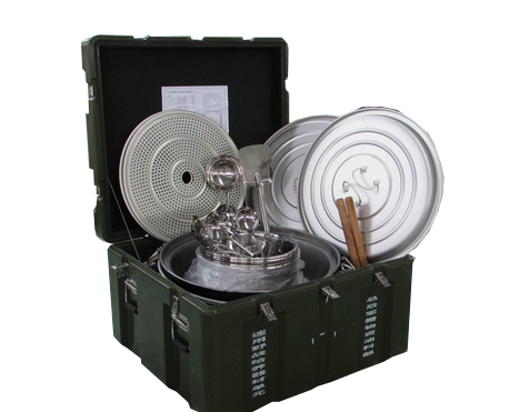 主要構件: 45L鋁行軍鍋2個、45L鐵行軍鍋1個、34厘米鋁合金菜盆20個、野戰燃油爐灶1套、行軍背架5付、7.5千克軟體油桶2個、20升送飯(背水)袋5個、行軍鍋罩袋2個、鍋鏟1個、炒勺1個、應急燈1個、篜盤1個、燜飯器2個、切菜(和面)布2塊、切菜板2個、菜刀2個、飯勺6個、調料袋1個、手套2副